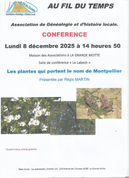 Prochaine conférence le lundi 8 Decembre 2025 par Regis MARTIN "Les plantes qui portent le nom de Montpellier"